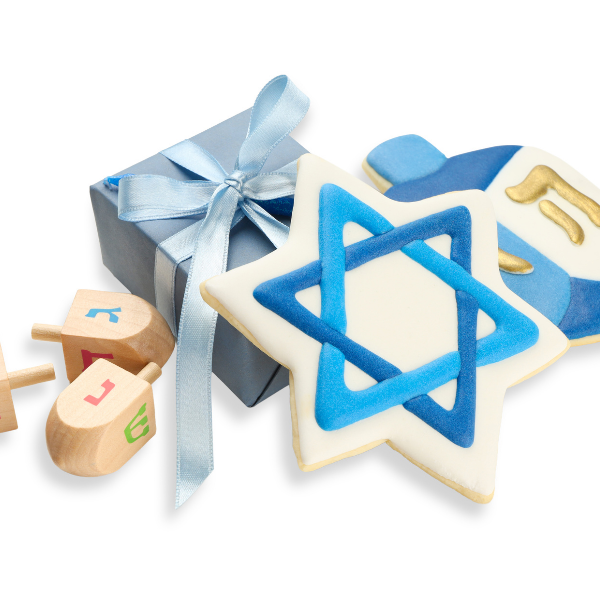 2 Cakesickles, 2 festive sprinkle cookies, 2 chocolate–gelt cookies, and 2 chocolate-marshmallow dreidels.